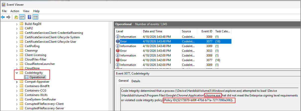 Applications and Services Logs → Microsoft → Windows → CodeIntegrity → Operational