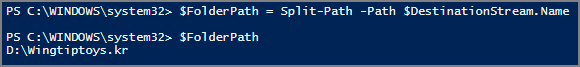여기서 $VHDLocation = "D:\wingtiptoys.kr" 으로 연결하기 위해서는 $DestinationStream.Name 에서 폴더 경로만 표시해야 합니다.