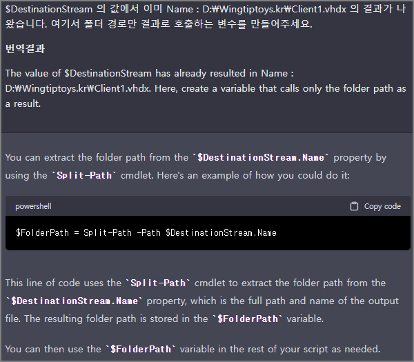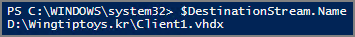 | $DestinationStream 의 값에서 이미 Name : D:\Wingtiptoys.kr\Client1.vhdx 의 결과가 나왔습니다. 여기서 폴더 경로만 결과로 호출하는 변수를 만들어주세요. |