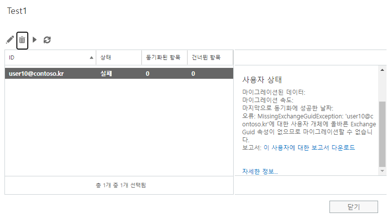 우선 실패 상태를 확인할 수 있습니다. 오류 메시지를 보면 해당 개체에는 Exchange GUID 값이 없다고 나타납니다.