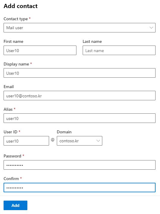 메일 사용자 (Mail user) 로 연락처 개체 생성