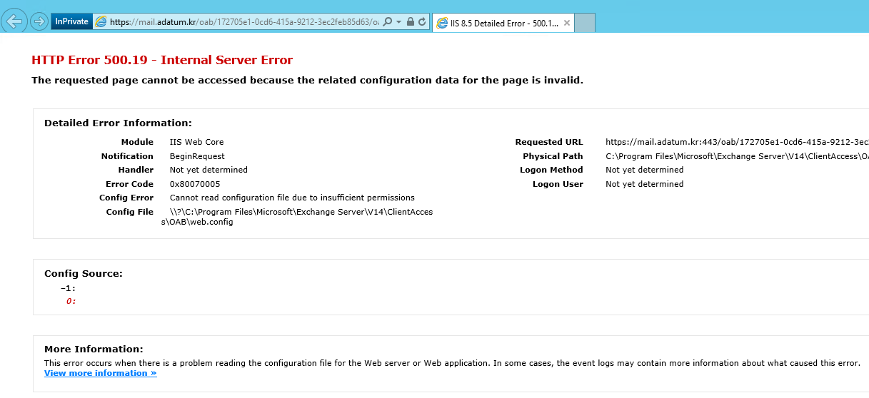 https://OWAURL/OAB/GUID/OAB.xml 접속시에는 80070005 Error 확인