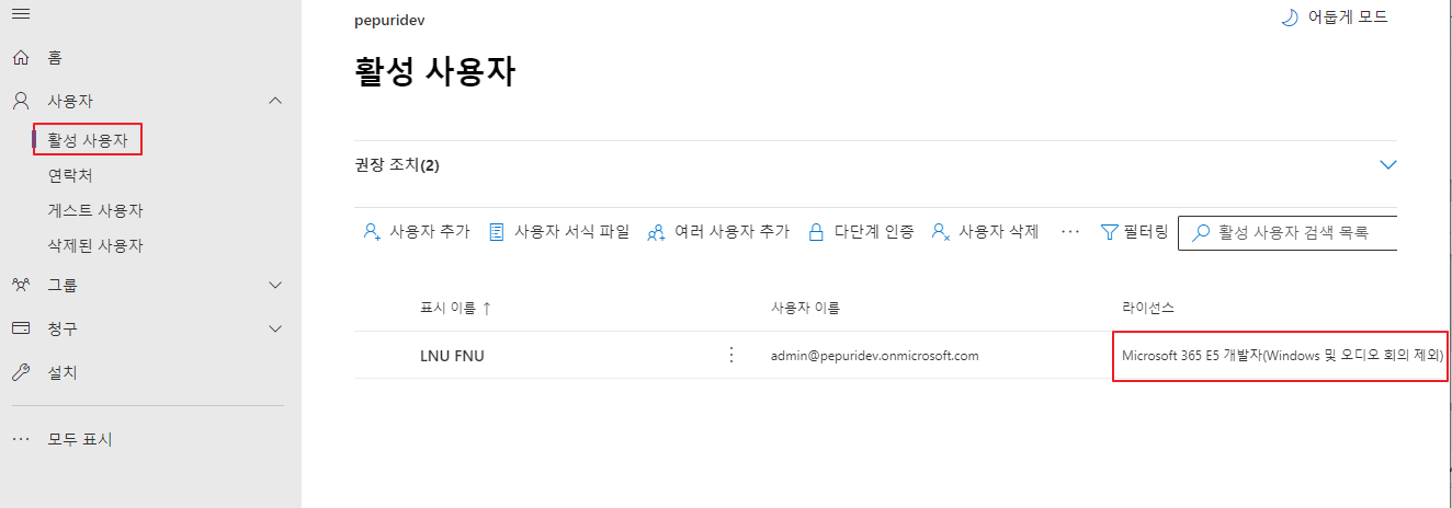 활성 사용자 메뉴로 이동하면 M365 E5 개발자 라이선스가 할당된 것을 확인할 수 있습니다.