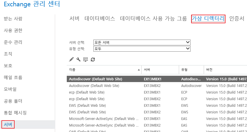 Outlook 등 여러 Client 연결을 위해서 가상 디렉터리 설정을 진행합니다.