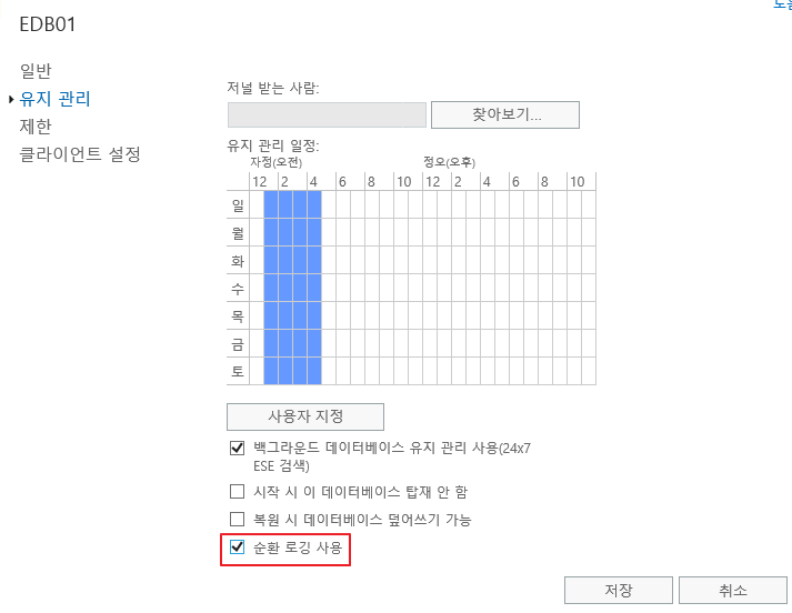 그리고 DB 의 로그의 용량은 상당하기 때문에, 백업 솔루션 사용여부에 따라서 순환 로깅 사용을 설정합니다. - 그리고 다시 탑재합니다.