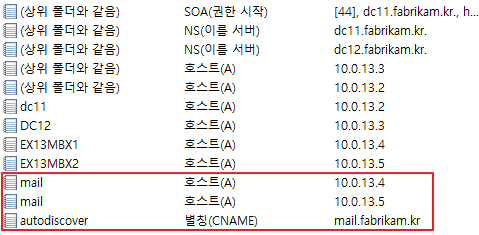 내부 DNS 서버, 외부 DNS 서버에 Autodiscover, OWA, MX 레코드에 대한 값을 입력합니다.