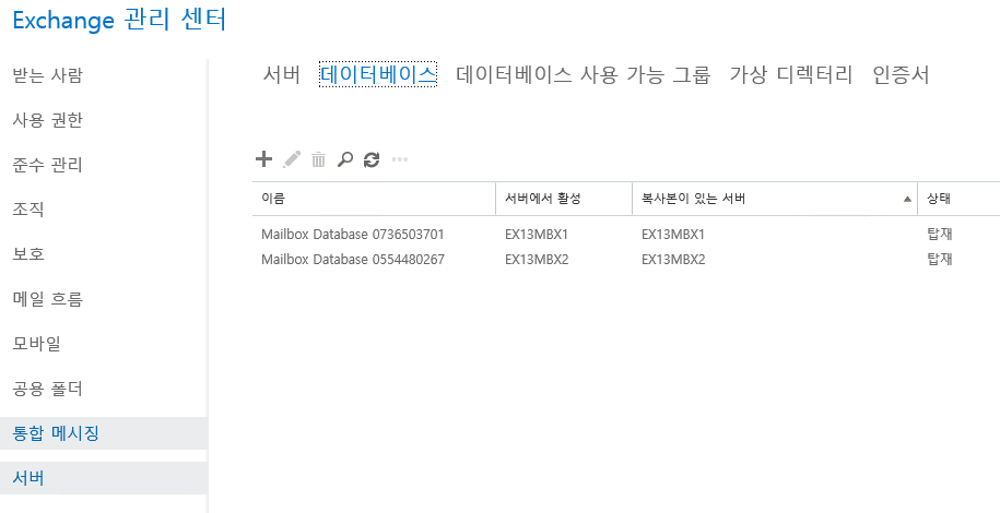 처음 설치시 생성되는 DB에는 System Mailbox가 존재하므로 삭제하면 안됩니다.