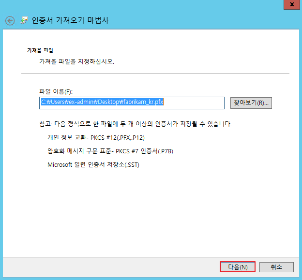 발급 받은 인증서를 각각의 Exchange 서버에 설치 합니다.