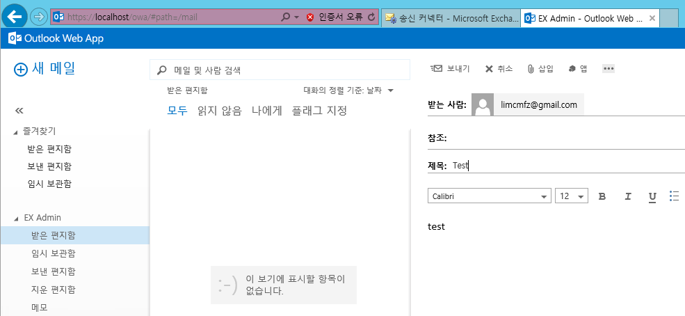 OWA 페이지( https://localhost/owa )에 접속 한 뒤, Gmail에 메일 발송을 시도합니다.