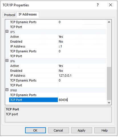 IPAll 에서 Dynamic ports 의 값을 TCP Port로 지정 - OK