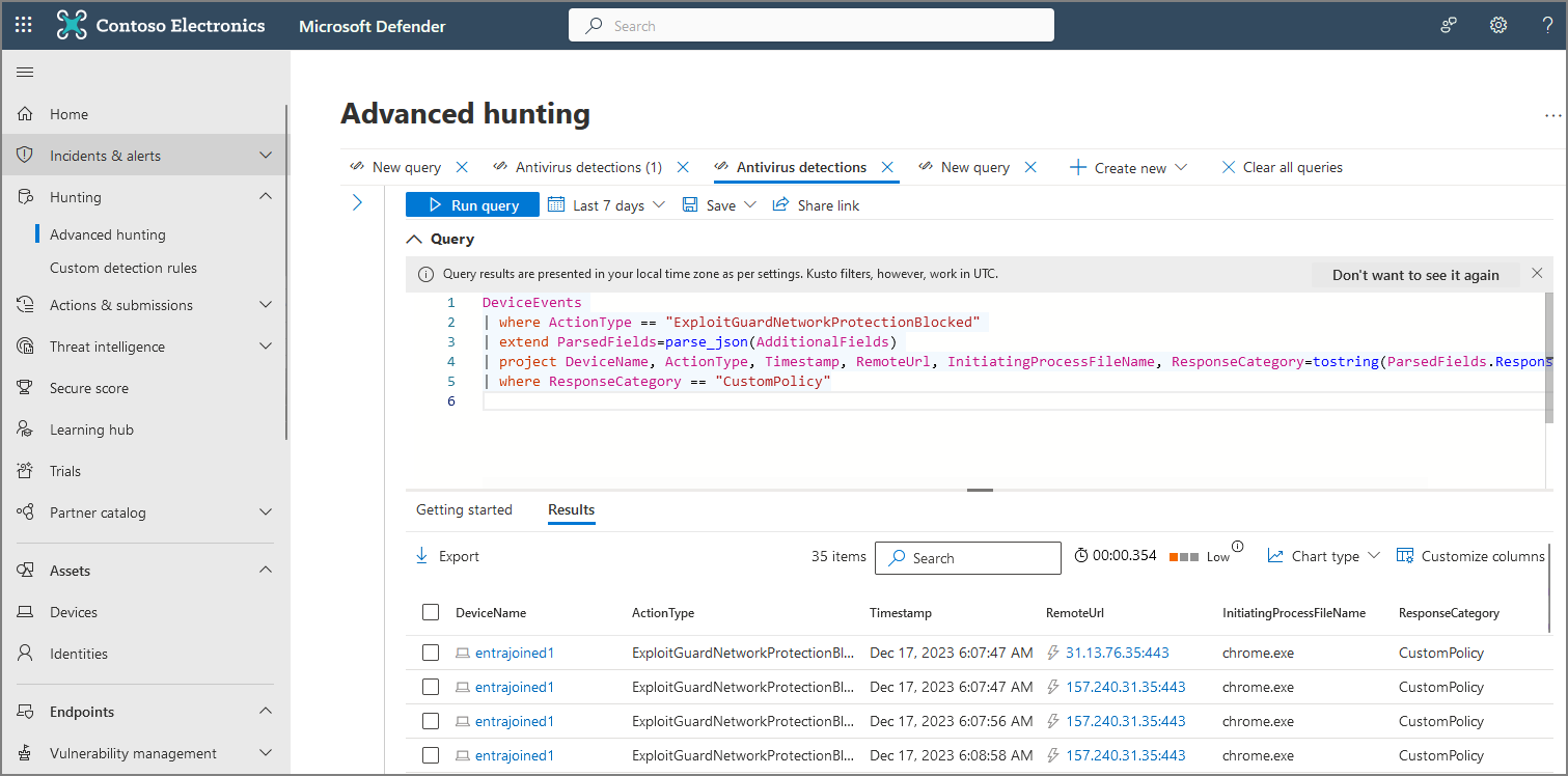 | project DeviceName, ActionType, Timestamp, RemoteUrl, InitiatingProcessFileName, ResponseCategory=tostring(ParsedFields.ResponseCategory)