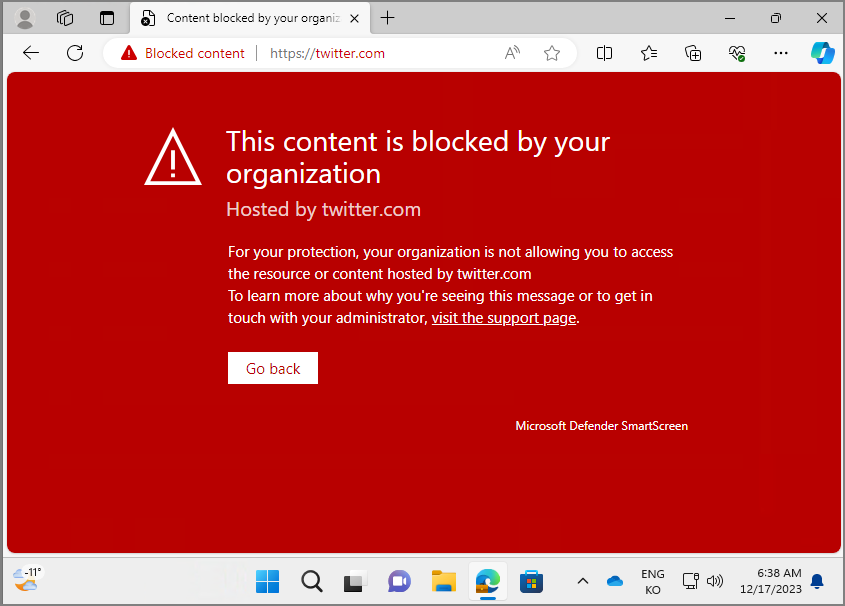 Edge 에서 twitter.com 접속 -> SmartScreen + Web Contents Filtering 적용 -> 차단 확인