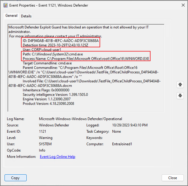ASR Rule ID가 기록되며, 관련된 세부 정보까지 확인할 수 있습니다.
