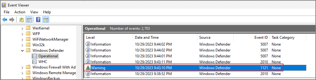 이벤트 뷰어 -> Applications -> Services Logs -> Microsoft -> Windows -> Windows Defender -> Operational