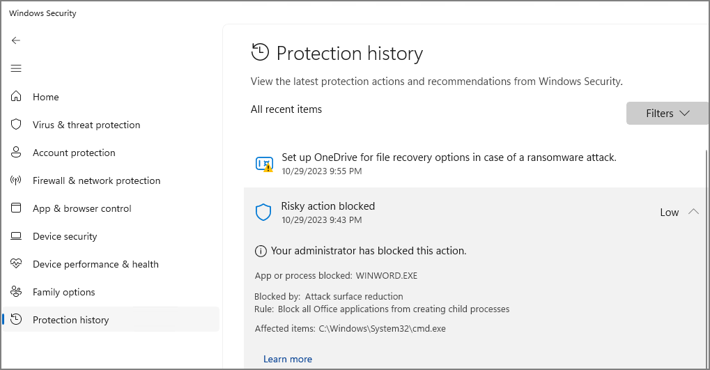 Windows Security -> Protection history에서도 확인할 수 있습니다.