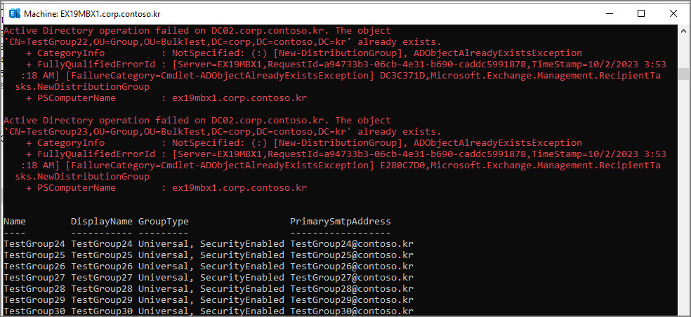 New-DistributionGroup -Name TestGroup1 -PrimarySMTPAddress TestGroup1@contoso.kr -DisplayName TestGroup1 -OrganizationalUnit 'OU=Group,OU=BulkTest,DC=corp,DC=contoso,DC=kr' -Type Security