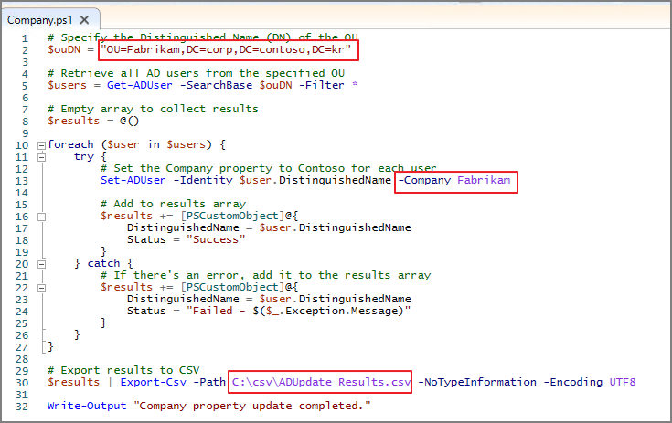 -> Fabrikam OU의 사용자 개체의 Company 속성을 Fabrikam으로 변경하는 Script가 완성되었습니다.
