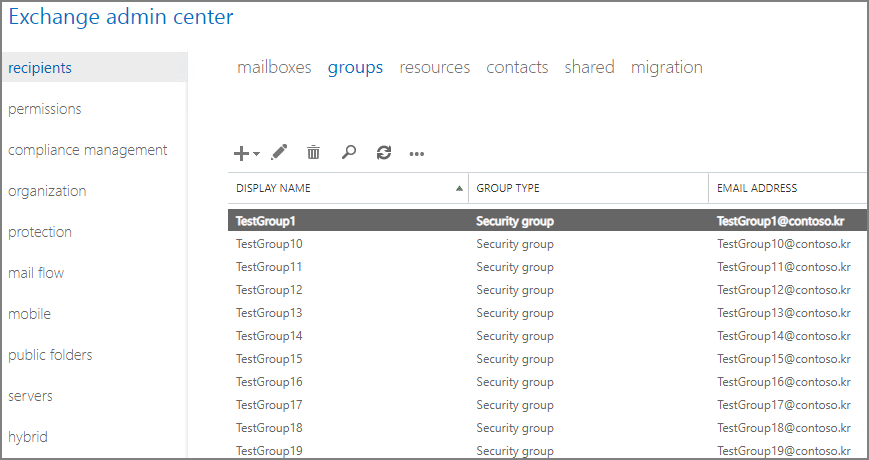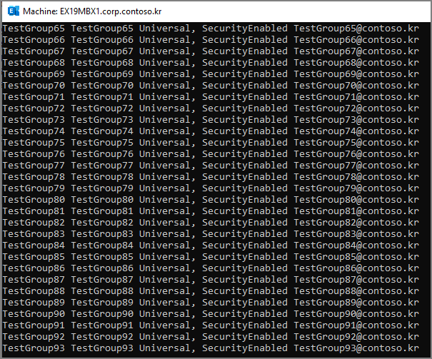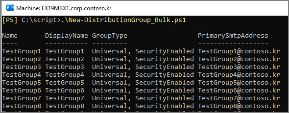 New-DistributionGroup -Name TestGroup1 -PrimarySMTPAddress TestGroup1@contoso.kr -DisplayName TestGroup1 -OrganizationalUnit 'OU=Group,OU=BulkTest,DC=corp,DC=contoso,DC=kr' -Type Security