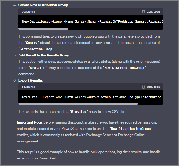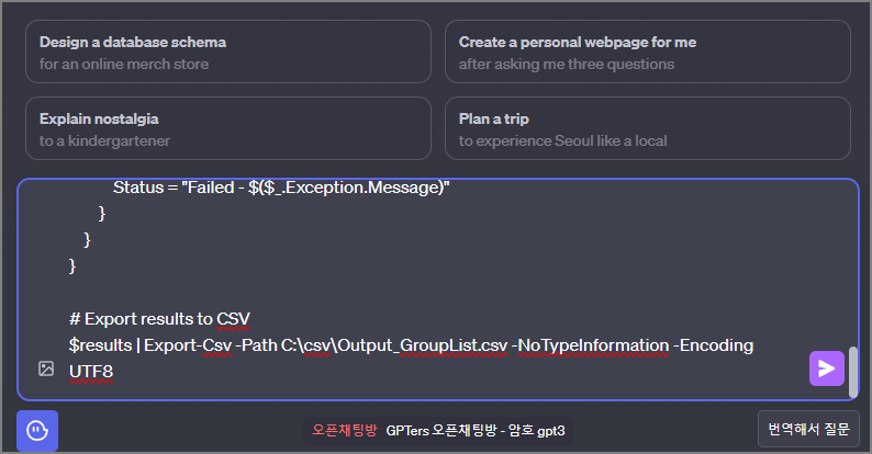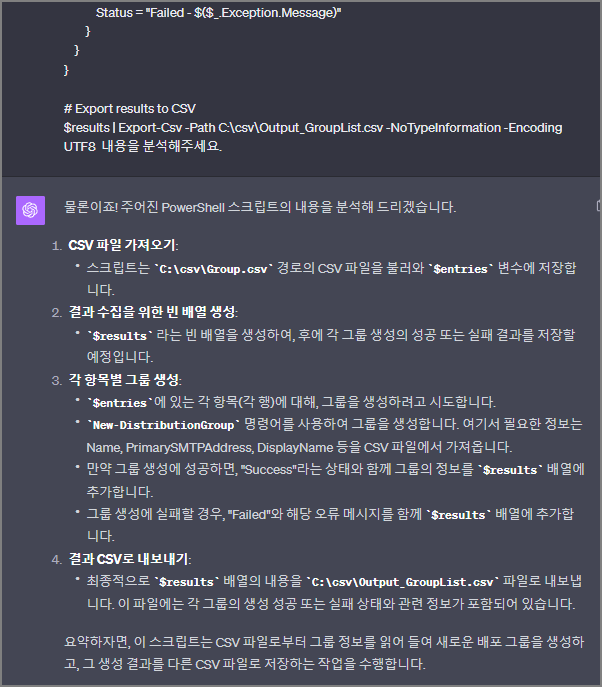 이번에는 ChatGPT에게 Import-Csv -Path C:\csv\Group.csv |ForEach-Object {New-DistributionGroup -Name $_.Name -PrimarySmtpAddress $_.PrimarySMTPAddress -DisplayName $_.Displayname -OrganizationalUnit 'OU=Group,OU=BulkTest,DC=corp,DC=contoso,DC=kr' -Type Security} 를 학습시킨 뒤, 진행 결과 및 오류에 대해서 CSV 로 내보내기는 Script 를 작성을 요청하였습니다.