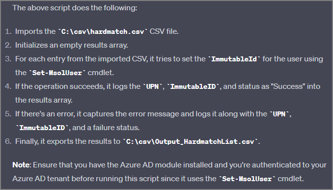 | Import-Csv -Path C:\csv\hardmatch.csv|Foreach-Object {Set-MsolUser -UserPrincipalName $_.UPN -ImmutableId $_.ImmutableID} 명령어도 위와 동일한 구조의 Script로 만들어주세요. |