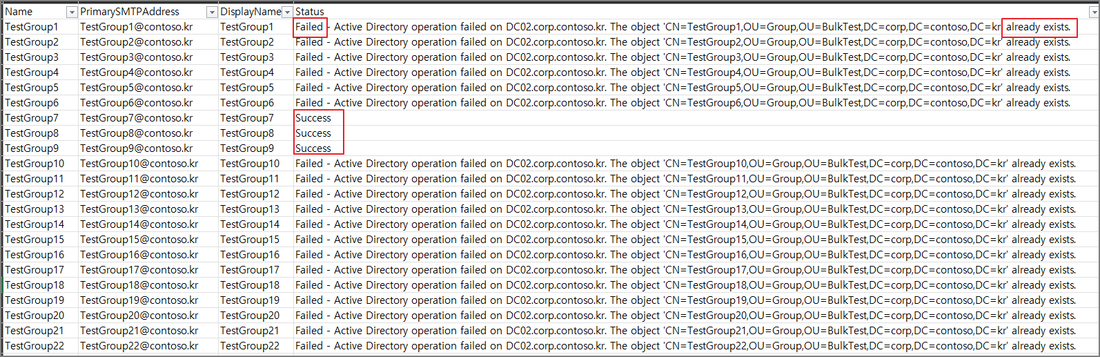 New-DistributionGroup -Name $entry.Name -PrimarySMTPAddress $entry.PrimarySMTPAddress -DisplayName $entry.Displayname -OrganizationalUnit "OU=Group,OU=BulkTest,DC=corp,DC=contoso,DC=kr" -Type Security -ErrorAction Stop
