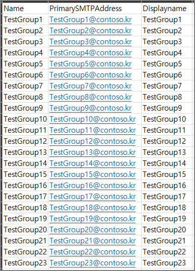 Group OU에 아래의 CSV 파일을 이용하여 메일 그룹 생성에 대한 요청을 받았습니다.