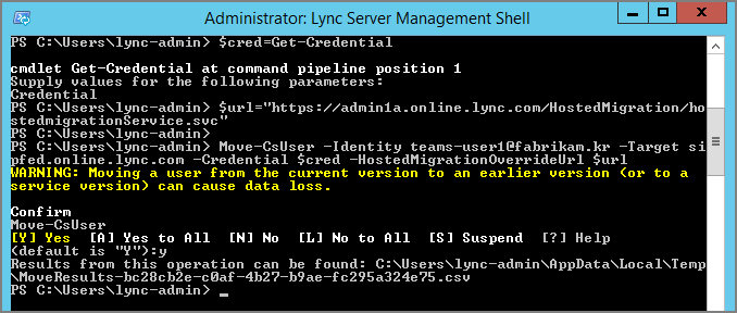 Move-CsUser -Identity teams-user1@fabrikam.kr -Target sipfed.online.lync.com -Credential $cred -HostedMigrationOverrideUrl $url