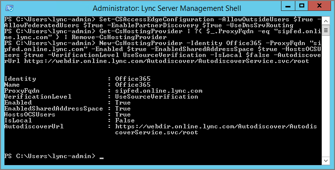 New-CsHostingProvider -Identity Office365 -ProxyFqdn "sipfed.online.lync.com" -Enabled $true -EnabledSharedAddressSpace $true -HostsOCSUsers $true -VerificationLevel UseSourceVerification -IsLocal $false -AutodiscoverUrl https://webdir.online.lync.com/Autodiscover/AutodiscoverService.svc/root