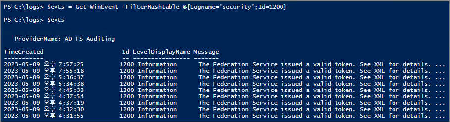 ADFS의 주요 로그인 이벤트는 1200~1207입니다. 아래의 항목들은 감사로그가 설정되면 확인할 수 있습니다.