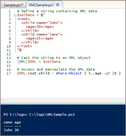 $XML.root.child | Where-Object { $_.age -gt 28 }