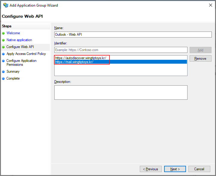 Identifier에 Autodiscover 및 MAPI URL 주소를 입력합니다.