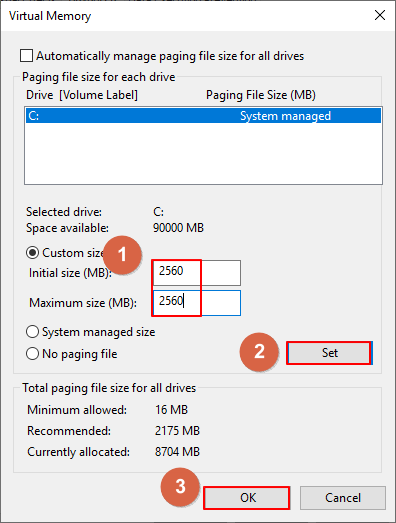 가상메모리는 퍼포먼스에 영향을 줄 수 있기 때문에 반드시 고정으로 설정하는 것을 권장합니다.