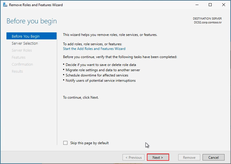 재부팅후 다시 역할 제거 메뉴로 이동하여 ADDS 제거 과정 진행