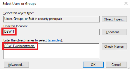 위치를 로컬로 지정한 뒤, Administrators 그룹을 추가합니다.