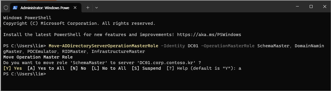 Move-ADDirectoryServerOperationMasterRole -Identity DC01 -OperationMasterRole SchemaMaster, DomainNamingMaster, PDCEmulator, RIDMaster, InfrastructureMaster