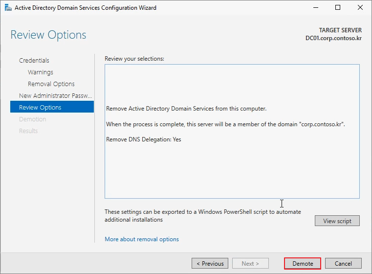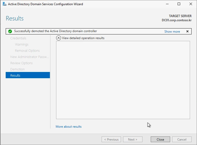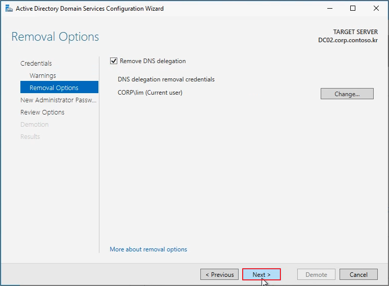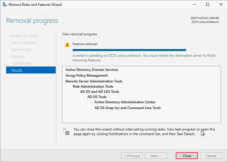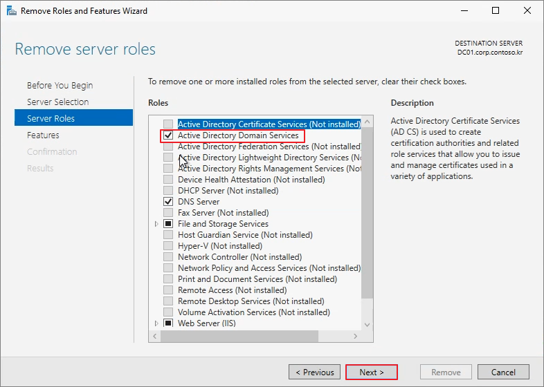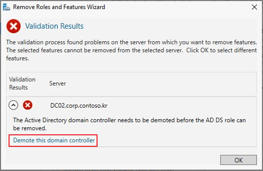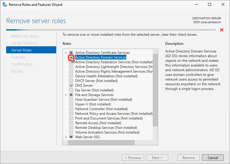재부팅후 다시 역할 제거 메뉴로 이동하여 ADDS 제거 과정 진행