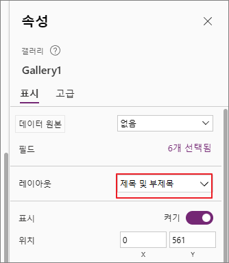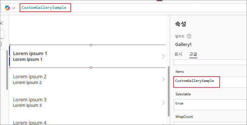 첫번째 항목 전체(Gallery 개체)를 선택 -> Items 속성을 변경하거나 상단의 속성에 qrScanner.Barcodes 를 입력합니다.