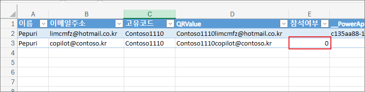-> QRValue와 PowerApps에서 인식한 결과 값인 QR Code가 일치한 열에 O를 표시