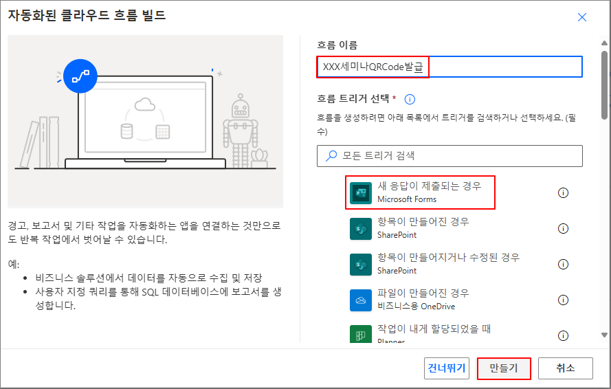 흐름 이름 입력 -> 새 응답이 제출되는 경우 선택 -> 만들기