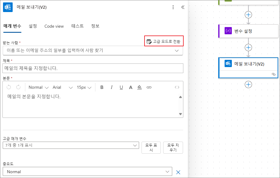 하단의 고급 매개변수를 메뉴에서 BCC에 본인 메일 주소를 추가합니다. (정상 발송여부 체크용)
