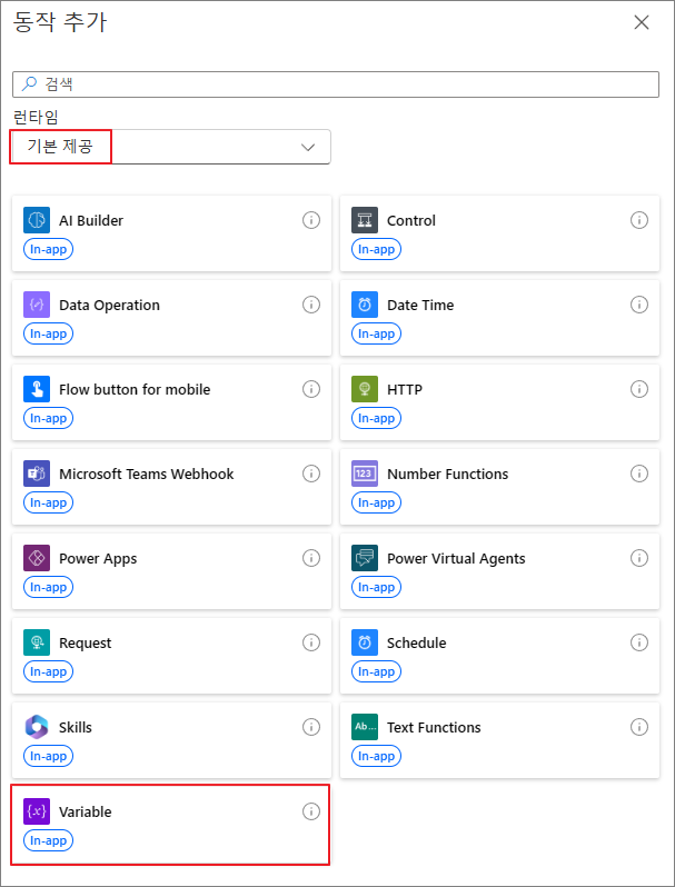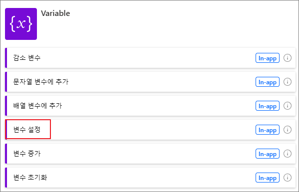 작업 추가 -> 런타임:기본 제공 -> Variable