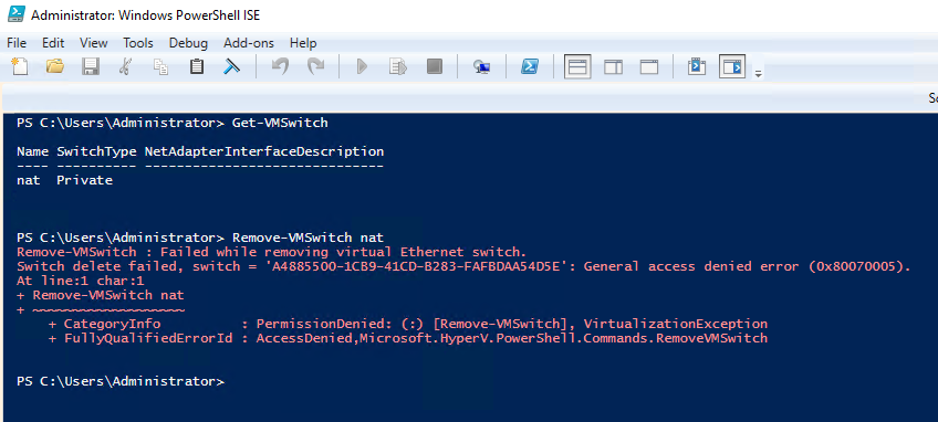 | PS C:\Users\Administrator> Remove-VMSwitch nat Remove-VMSwitch : Failed while removing virtual Ethernet switch. Switch delete failed, switch = 'A4885500-1CB9-41CD-B283-FAFBDAA54D5E': General access denied error (0x80070005). At line:1 char:1 + Remove-VMSwitch nat + ~~~~~~~~~~~~~~~~~~~ + CategoryInfo : PermissionDenied: (:) [Remove-VMSwitch], VirtualizationException + FullyQualifiedErrorId : AccessDenied,Microsoft.HyperV.PowerShell.Commands.RemoveVMSwitch |