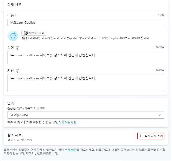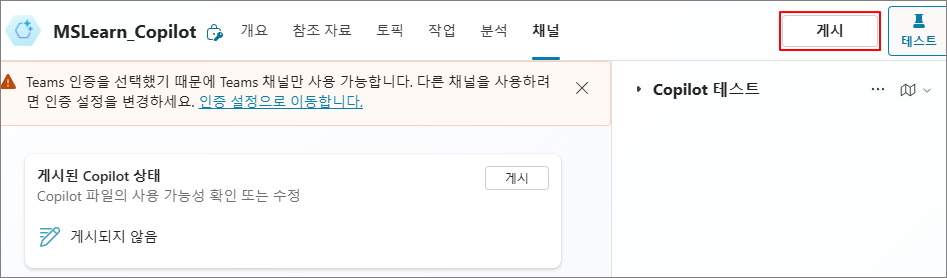 우측의 Copilot 테스트 채팅창에서 질문을 입력하여 답변이 올바르게 진행되는지 확인합니다.