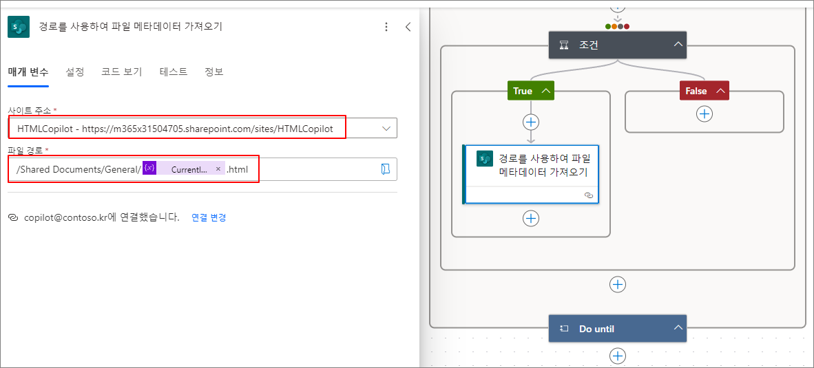 -> HTMLCopilot 사이트에 문서 라이브러리에 1.html 파일이 있다면. 이라는 조건을 생성할 수 있습니다. 이렇게 지정하는 이유는 중복 생성을 막기 위함 입니다.