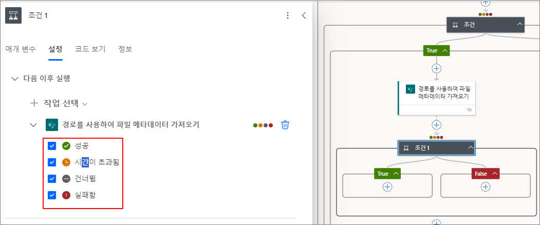 설정 -> 다음 이후 실행 -> HTTP에서 4가지 상태를 전부 지정합니다.