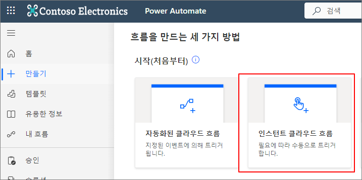 수동으로 실행을 원한다면, 전반적인 흐름은 같고, 생성시 인스턴트 클라우드 흐름을 선택합니다.