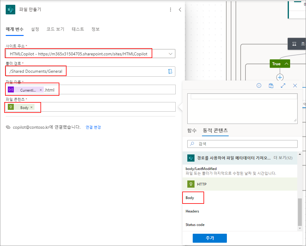 사이트 및 폴더 경로 지정, 파일 이름은 CurrentIndex.html 동적 형태로 지정. 파일 콘텐츠는 HTTP에서 호출되는 Body를 지정합니다.