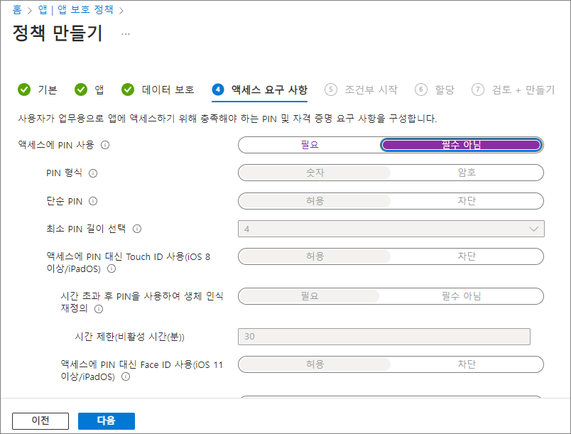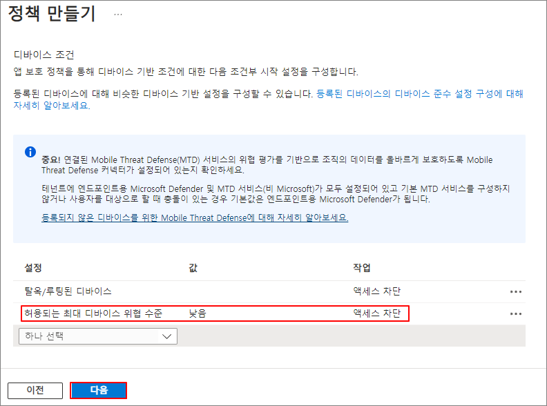 허용되는 최대 디바이스 위협 수준 -> 낮음 -> 액세스 차단 -> 다음