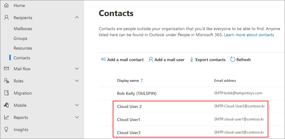 테넌트간 동기화 설정은 아래와 같이 Source Tenant에서 Outbound 설정, Target Tenant에서 Inbound 설정을 진행하여 Guest 계정 형태로 동기화 하는 방식으로 진행됩니다. Guest 계정은 Mail User 속성을 가지고 있기 때문에 주소록에서 확인할 수 있습니다.
