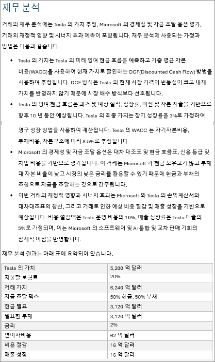 예를 들어서 MS가 테슬라를 인수하였을 때 얻는 효과에 대한 가상의 시나리오를 작성하겠습니다.